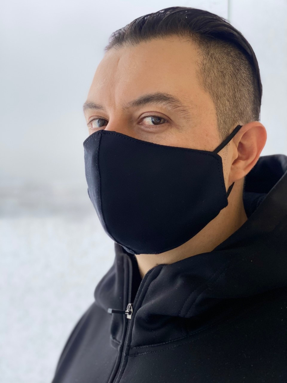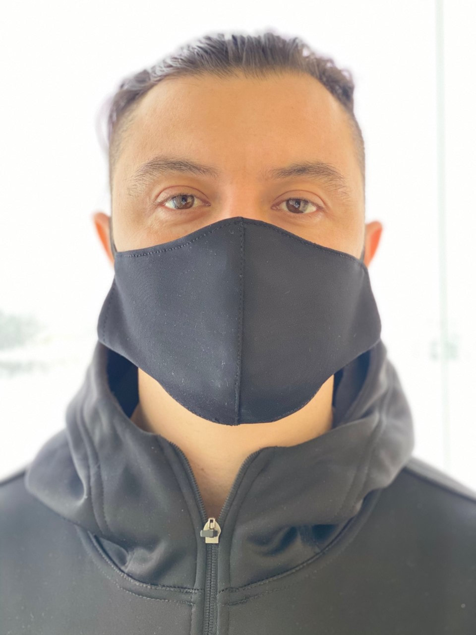 Pestävä maski teknistä, roiskeita hylkivää ja antibakteerista materiaalia. Kaksinkertainen kangas, ommel keskellä. Kumilenkit korvien takana.