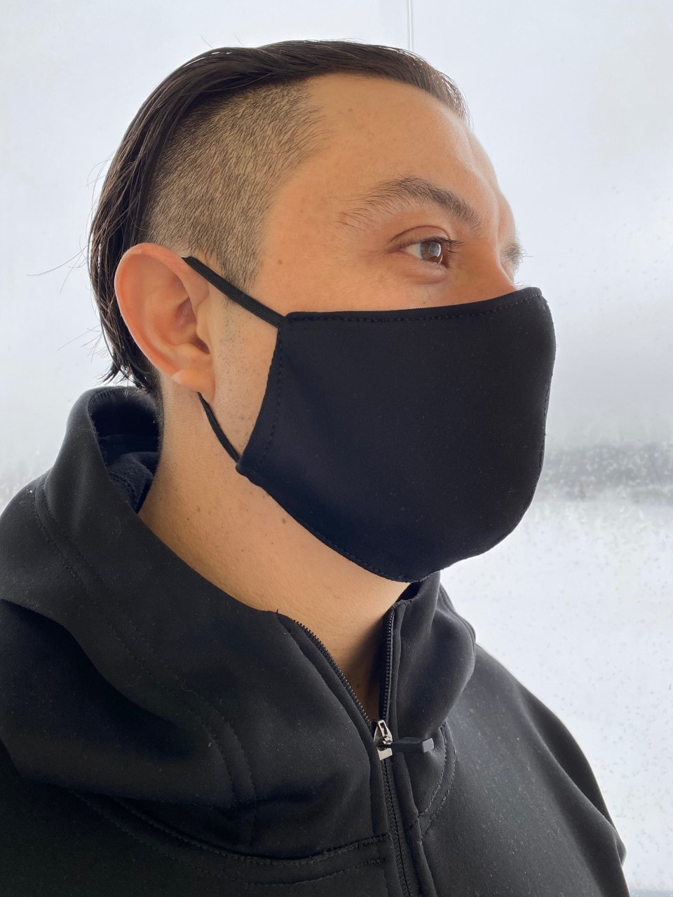 Pestävä maski teknistä, roiskeita hylkivää ja antibakteerista materiaalia. Kaksinkertainen kangas, ommel keskellä. Kumilenkit korvien takana.